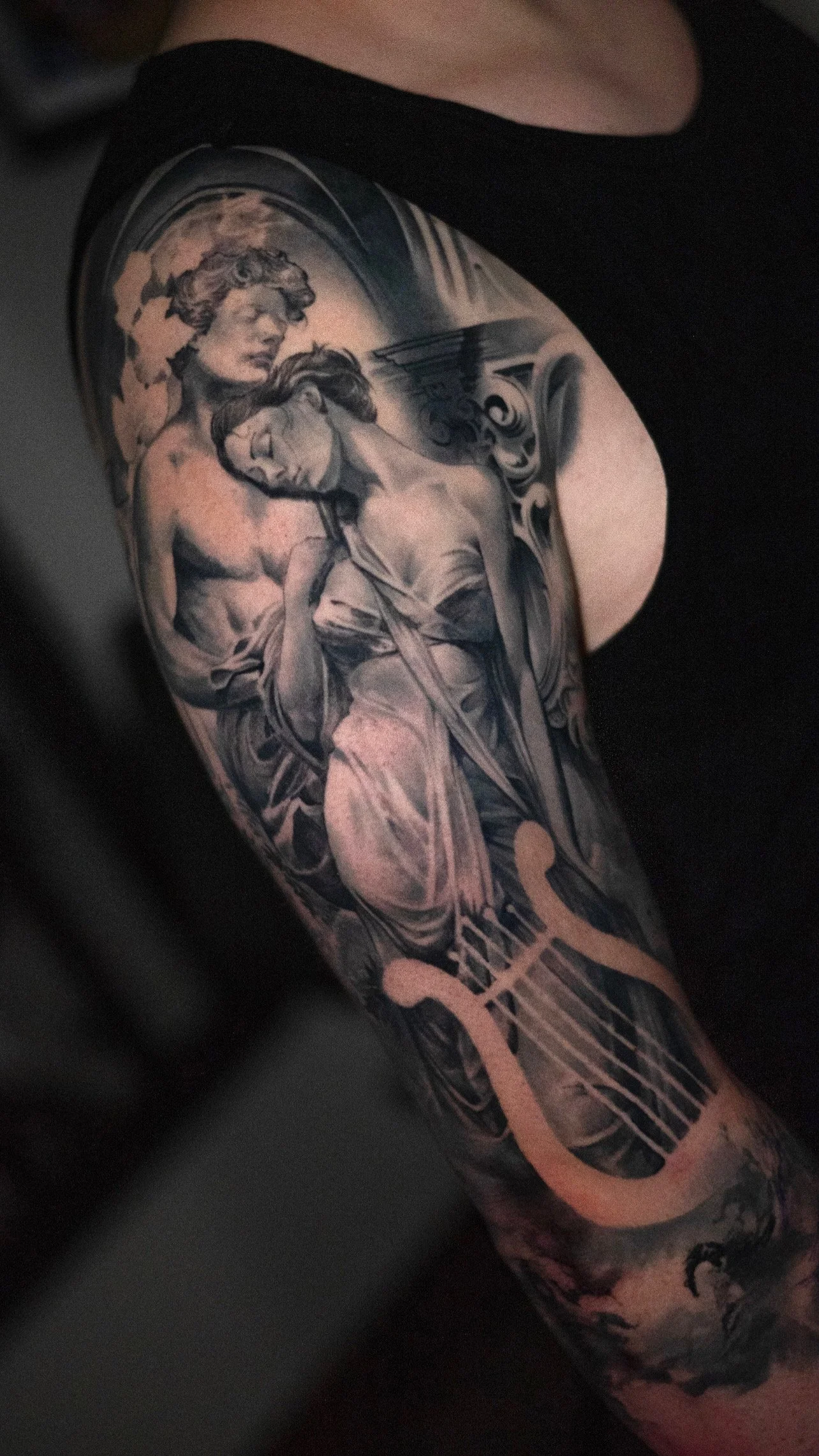 Renowned tattoo artist Jerrel Larkins is recognized for his distinctive style and exceptional craftsmanship. With a focus on both quality and longevity , he approaches each piece as a work of art. Boasting over 15 years of experience and expertise, he designs custom tattoos that captivate his clients. As a pro team member of Grip Needles and co-owner of Saint Valca Tattoo in Las Vegas, Jerrel is an award-winning artist who was also featured on the popular show Ink Master season 13. He is committed to delivering only the highest quality work, specializing in dark art, surrealism, black and grey realism, and color tattoos. Jerrel's creations are meticulously crafted to achieve the perfect composition on the wearer, resulting in art that you can proudly display.